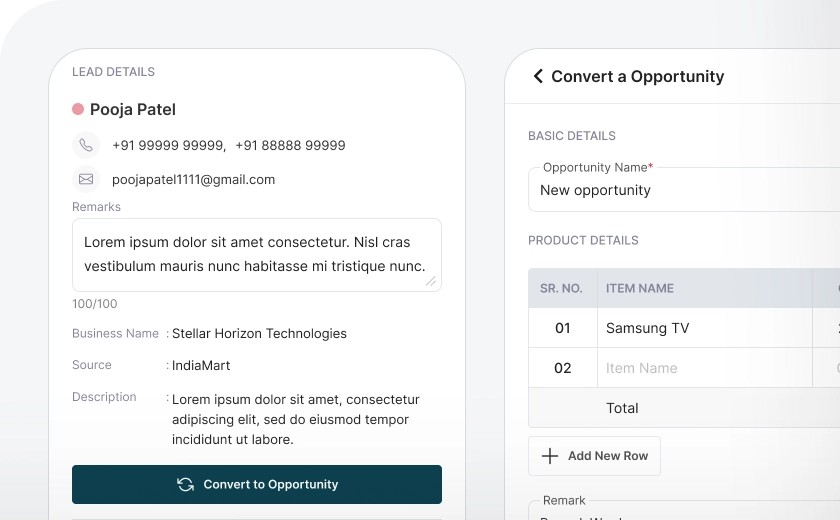 Create or capture leads from integrated platforms and distribute among relevant employees manually or automatically as per your requirements just by a click with sales tracking software. Get notified on receiving new leads and set reminders to get notifications for follow ups. Convert leads into Opportunity and nurture Opportunity with personal attention by knowing your customer’s use case and expectations and close deals faster.