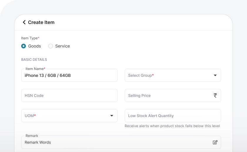 You can easily add inventory by clicking the "Create New" button and filling in the required fields. Whether you're adding goods or services, the process is simple. Just enter details such as the item name, group, HSN code, GST details, product description, and upload product images. Once all the information is filled in, you can save the record, ensuring that your inventory is accurately updated and ready for management.