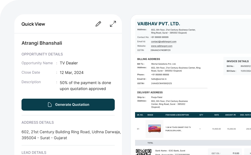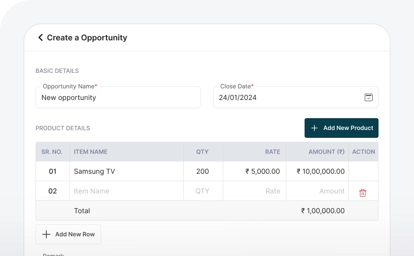 Once an opportunity is created and the desired product is selected, you can generate a quotation with a single click. The quotation will be automatically saved within the opportunity section for easy access and tracking.