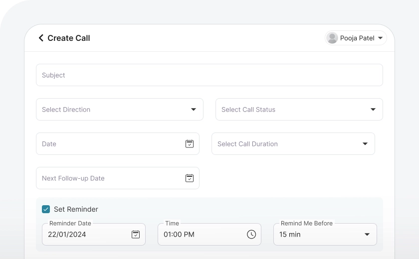 Track every call with complete details, including inbound/outbound status, call summary, follow-up dates, and reminders to maintain seamless communication. This keeps client interactions organized and you can set follow-up dates as well.