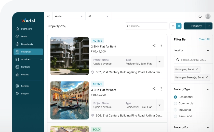 After listing properties, you can view them in two ways: List View, where properties are shown in a simple table with details like price and location, and Card View, where each property appears in a card with images and key information. Both views make it easy to search and compare properties based on your preference.