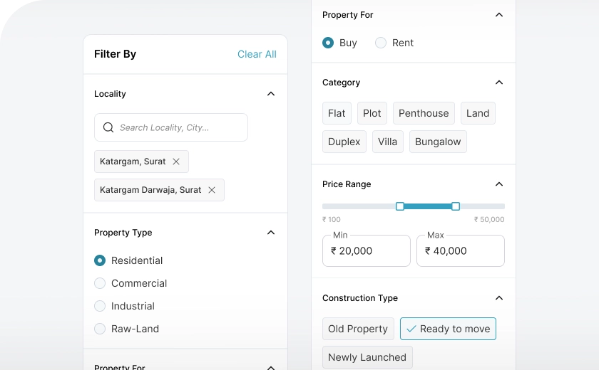 Our platform offers advanced filtering options to help you find the best-suited property based on your specific requirements. By applying a variety of filters, you can narrow down the available options to match your preferences precisely. Filters include locality, property type, such as residential, commercial, or industrial; property for, whether you're looking to buy, sell, rent, or lease; price range, construction type, such as new builds or pre-owned; and furnishing.